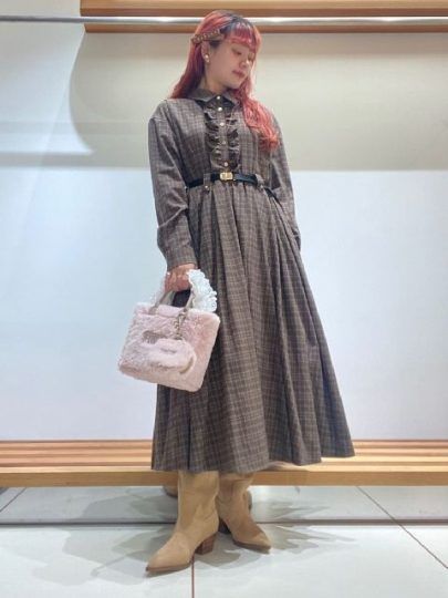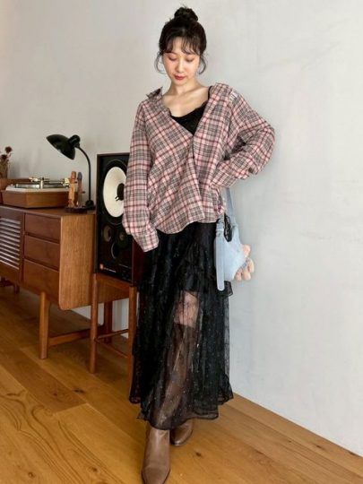 フリルシャツワンピースは、深みのあるブラウン系なら甘くなりすぎず大人っぽいコーデが実現。チェック柄ならさらに秋らしさが増して垢ぬけます。