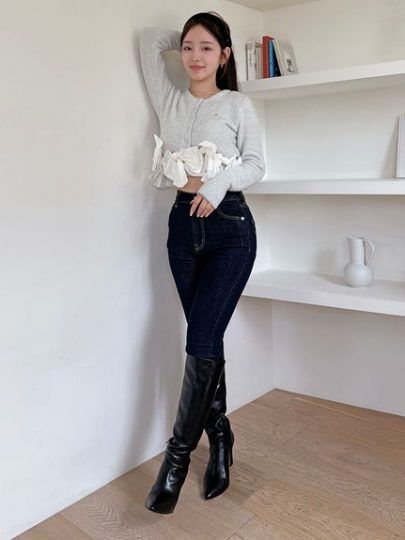スキニーデニムは、ブーツインするとスタイルアップ効果抜群。同色で揃えると、境目が曖昧になって脚長に見えます。