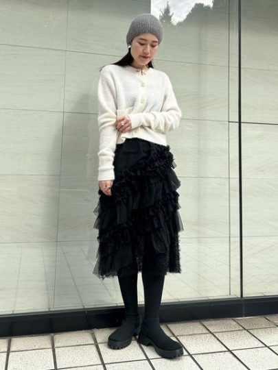 ボリュームの出やすいチュールスカートやティアードスカートは、タイトなロングニットブーツが相性抜群。同色のブラックで引き締めれば、どんな体型の方もスッキリとしたシルエットに見えます。甘くなりすぎないよう、カーディガンをあわせたら、ニット帽でカジュアルダウンさせましょう。