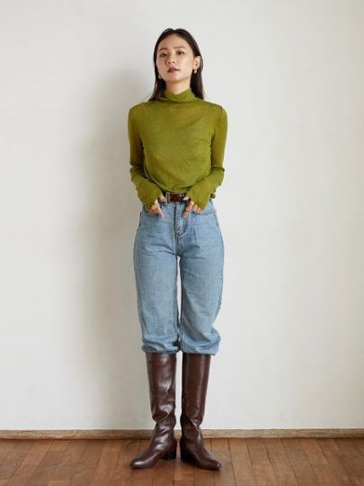 ロングブーツ自体が脚を細く見せてくれる効果が高いので、無理に高いヒールを選ばなくてもスッキリとした脚長シルエットが叶いますよ。