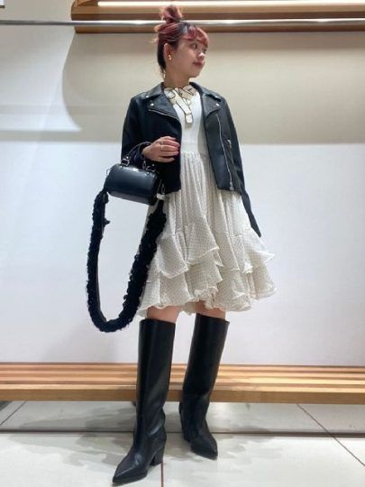 フレアなワンピースには、ライダースジャケットをあわせた甘辛ミックスに仕上げるのがおしゃれさんの定番着こなし術。ミニ丈なら、ロングブーツをあわせればフェミニンさが引き立ってモテコーデにワンランクアップします。