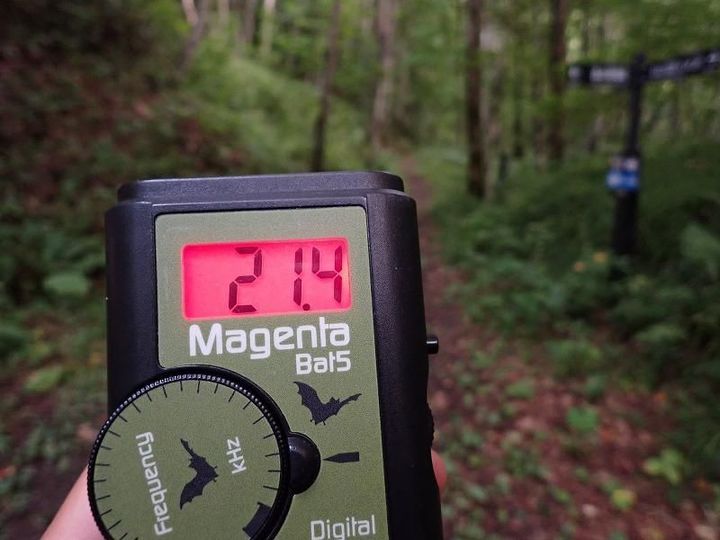 鳥を探すときは鳴き声の違いで種類を見分けたりしますが、実はコウモリも種類によって使っている周波帯が違うんです!なので、調査中はダイヤルを回してどの周波で反応するかを確認しながら夜の森を歩き回ります。