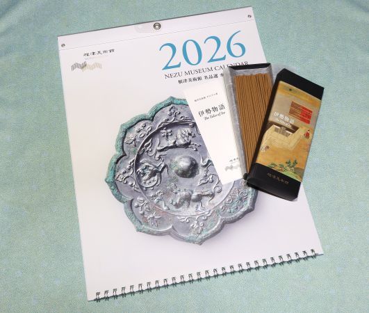ミュージアムグッズは、2026年カレンダー(2‚000円)とオリジナル香 「伊勢物語」(1‚700円)、特別展図録「在原業平生誕1200年記念 特別展 伊勢物語―美術が映す王朝の恋と歌―」(3,000円)を購入。 カレンダーは根津美術館所蔵の古美術品が月ごとに掲載されています。オリジナル香は『伊勢物語』第四段「西の対」にちなんだ夜の闇にほのかに香る梅の花をイメージしたお香だそうです。