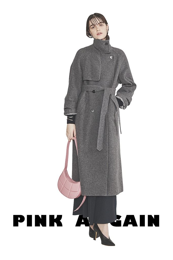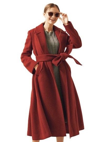 グレーのあいまいな色味は、ヴィヴィッドカラーの迫力を和ませるのにも便利。羽織るだけでドレッシーな雰囲気を醸し出す、ラグジュアリーな赤のロングコートを、グレーのワンピースと一緒に。