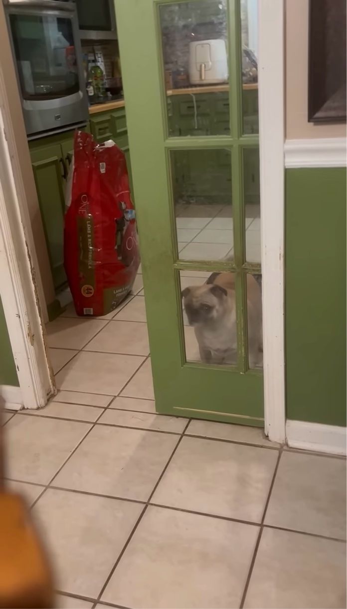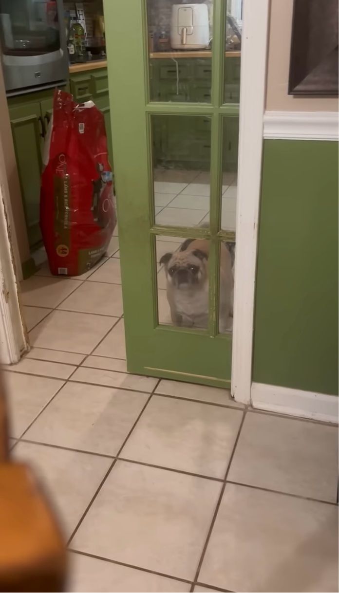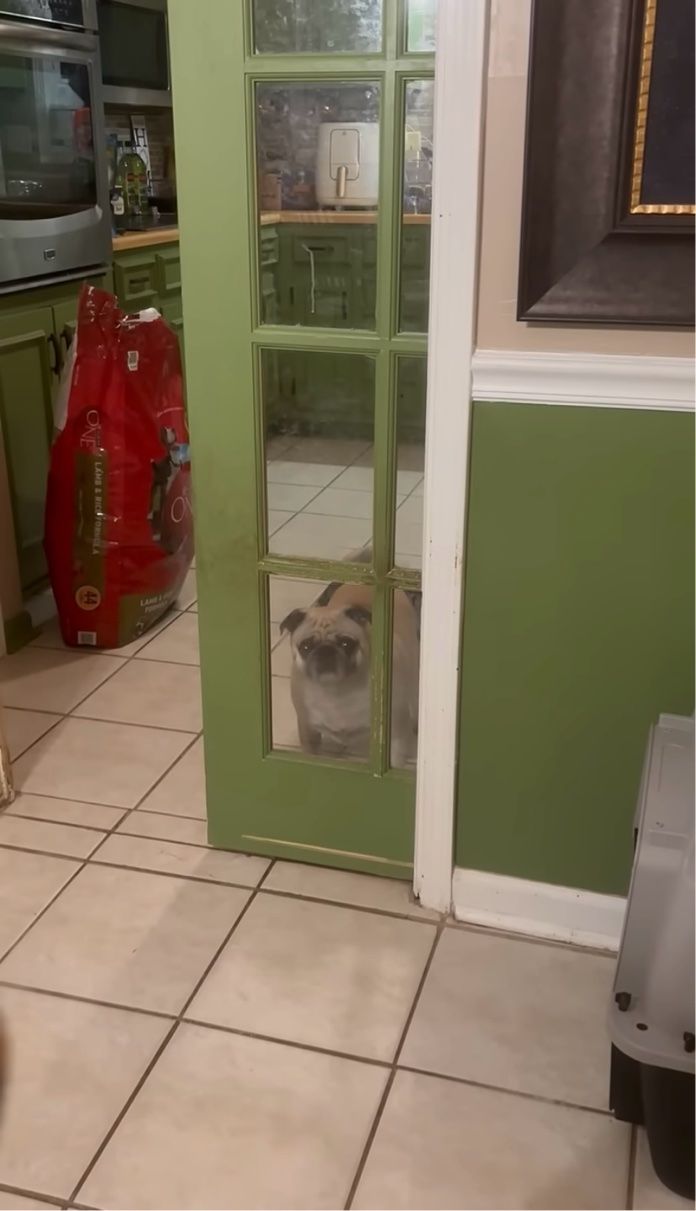 キッチンの方から強い視線を感じた飼い主さん。 そこには、ドアのガラス越しにじっと見つめてくるパグの『ファントム』の姿がありました。