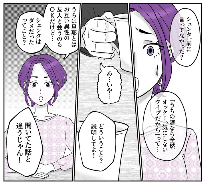 3. <気持ち悪い関係>異性友人、妻OKは嘘?聞いてた話と違う!相手の怒り【まんが:夫の気持ち】
