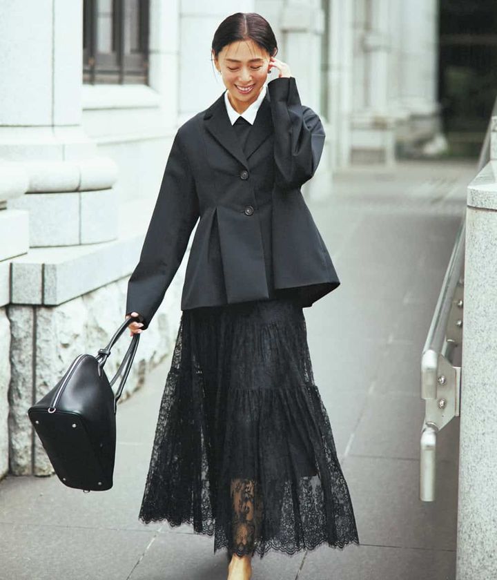 会う人やTPOは意識しながら、トレンド感もさりげなく取り入れたい学校行事。信頼感を纏えるジャケットをベースに、旬な素材やシルエットでアップデートすればAllブラックでも怖見えしない華のあるスタイルが完成!甘さとモード感を両得した構築的なジャケット×ドレッシーなレーススカートで全方位オシャレに。