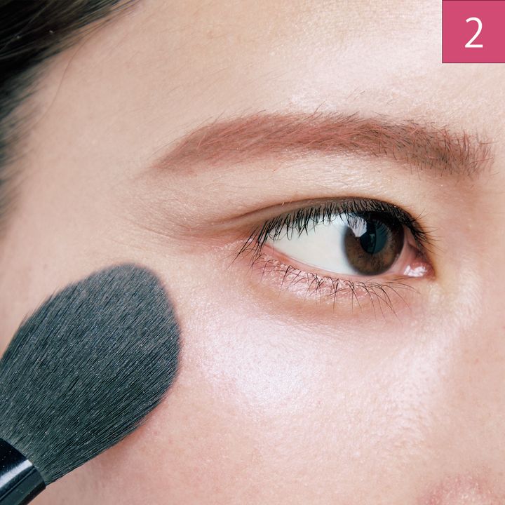ハイライトをブラシに取り、頰骨から目の下~目頭までしっかりのせて輝きをプラス。オレンジシャドウで囲って完成。