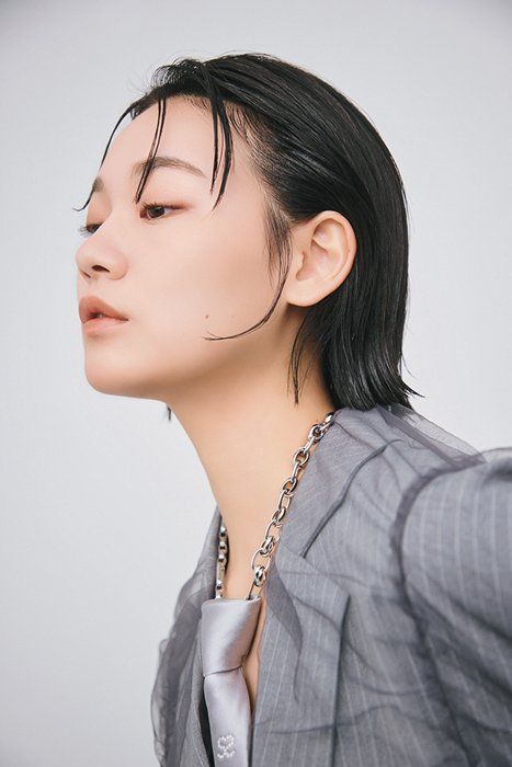 分け目や毛先のラインなど直線を強調した、ど直球のカッコよさに惚れ惚れ。あご上のボブにトップからレイヤーを入れて角を落とし、前髪は目にかかる長さでワイドにカット。パーマで直毛を柔らかく曲げたような自然な仕上がりに。オールバックで乾かし、ジェルグリースでツヤとタイト感をオン。