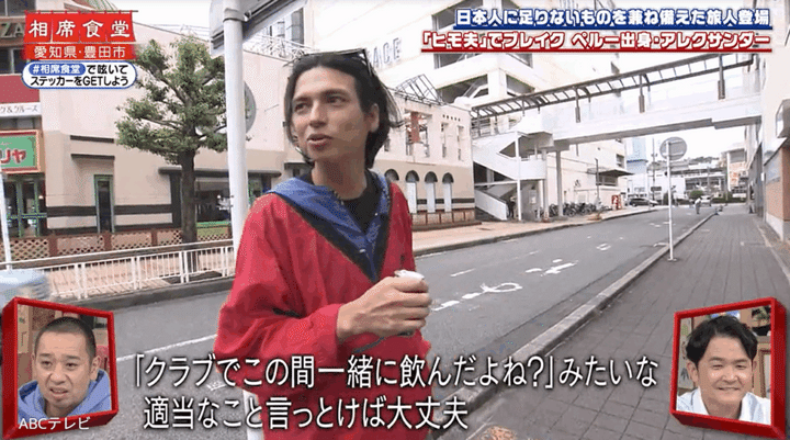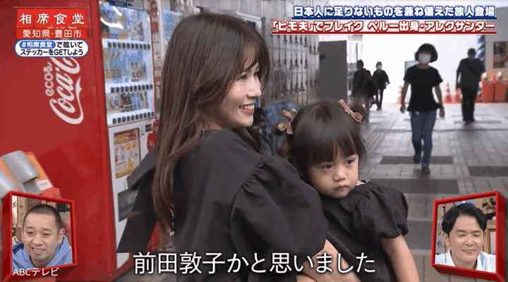「元はナンパ師」「ナンパで奥さんと知り合った」というアレクは、ロケ地・愛知県豊田市の情報を手に入れようと、近くにいた一般女性に声をかけた。女性は、2歳の子どもを育てる美人ママ。彼女のことをアレクは、「こんにちは~めっちゃかわいいじゃん!」「あっちゃん?」「前田敦子かと思いました!」などと褒めまくった。