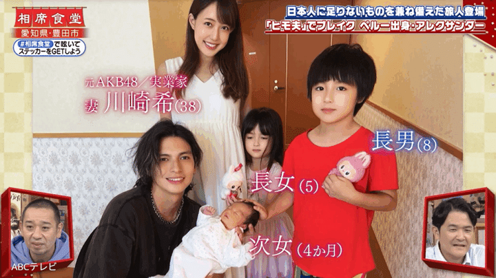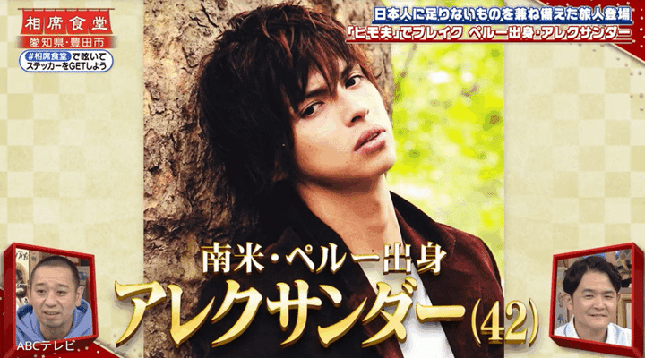 『相席食堂』に登場したのは、「アレク」の愛称で知られるモデルのアレクサンダー。ペルー出身のアレクは、日系の父親とペルー人の母親をもち、10歳の頃に来日。2013年にAKB48の元メンバーで実業家・川崎希と結婚し、「浮気者のヒモ夫」として一躍有名になった。42歳になった現在は3児のパパで、「ロケはめちゃくちゃ久しぶりっすね。実はちょっと緊張する。最近は子育てしかしてないっすね」とのこと。