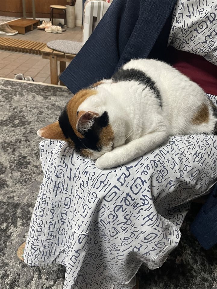 旅館の看板猫が「ごめん寝」しているまさかの場所。お客さんの膝の上で丸くなっている姿に反響「起きるまで動けませんね」「若女将~お疲れでしたかぁ?」