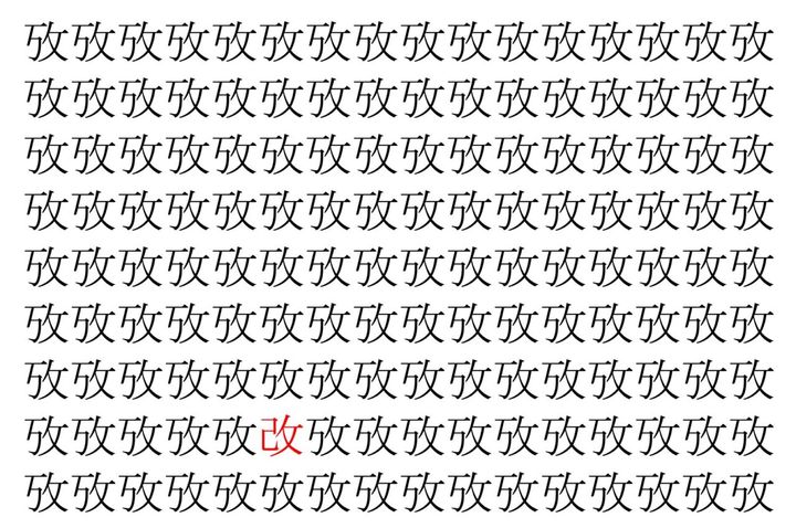 画像の中には、「攷」という漢字が縦に9行、横に16個並んでいます。 全部で144個となりますが・・・、そのうち1つは「異なる漢字」となってますよ!!