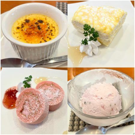 ▲クレームブリュレ・ミニクレープ・ストロベリーロールケーキ・さくらアイス