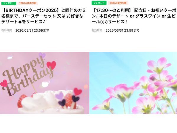 ほかにもバースデー月に1回使える誕生日クーポンや、記念日月のディナーに使える記念日クーポンもありました。