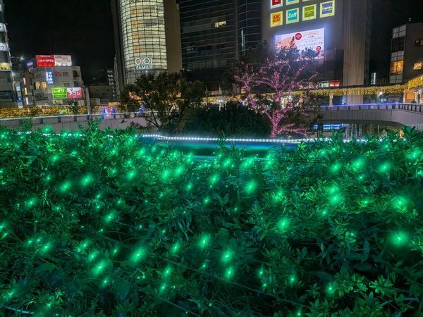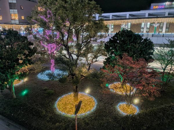 約30万球ものLEDが駅前を彩り、さまざまな色の光が街を包み込むように輝いています。