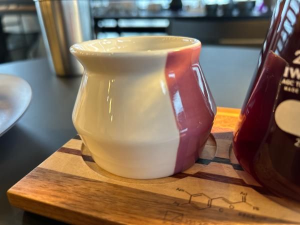 珈琲の器も、飲み口が非対称なんです。見えますか?「味わいが変わるので両方試してみてください」ということでした。白い方は、少量ずつ珈琲が口の中にゆっくり入ってきて、ピンクの方は、多めの珈琲が勢いよく入ってくる感じです。