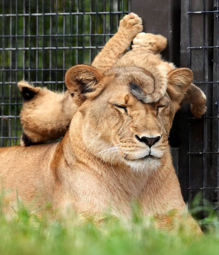 こちらは、愛知県豊橋市「のんほいパーク(豊橋総合動植物公園)」で暮らしているライオンの親子。 仔ライオンが母ライオンの頭の上で仰け反っていて、尻尾が母ライオンの顔にかかっています。