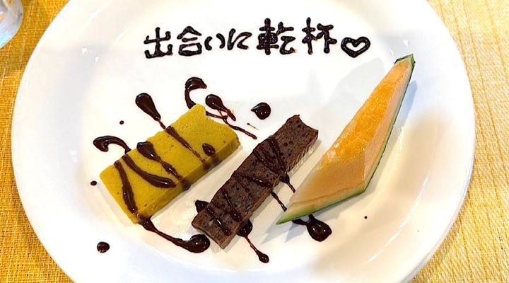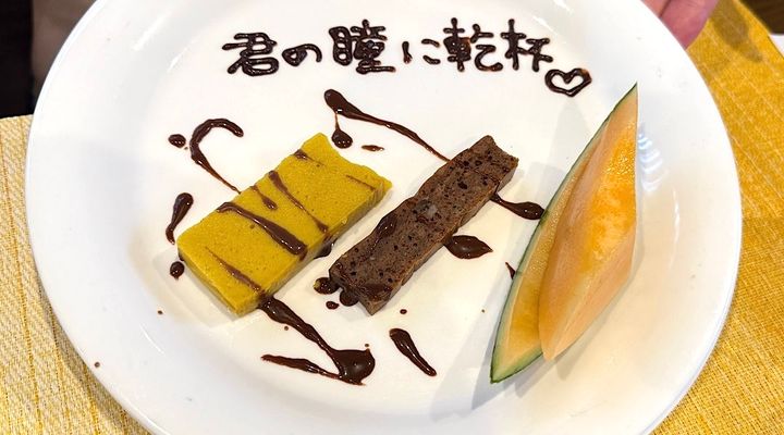 デザートは、かぼちゃケーキとチョコレートのデザート、日光MERON添え