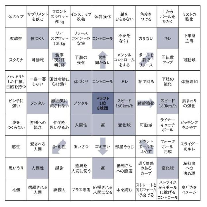 中央の強い目標には「8球団からドラフト1位指名を受ける」と書き、その大目標を達成するために「体づくり」「コントロール」「キレ」「メンタル」「スピード時速160キロ」「人間性」「運」「変化球」の8要素を書き込んでいます。