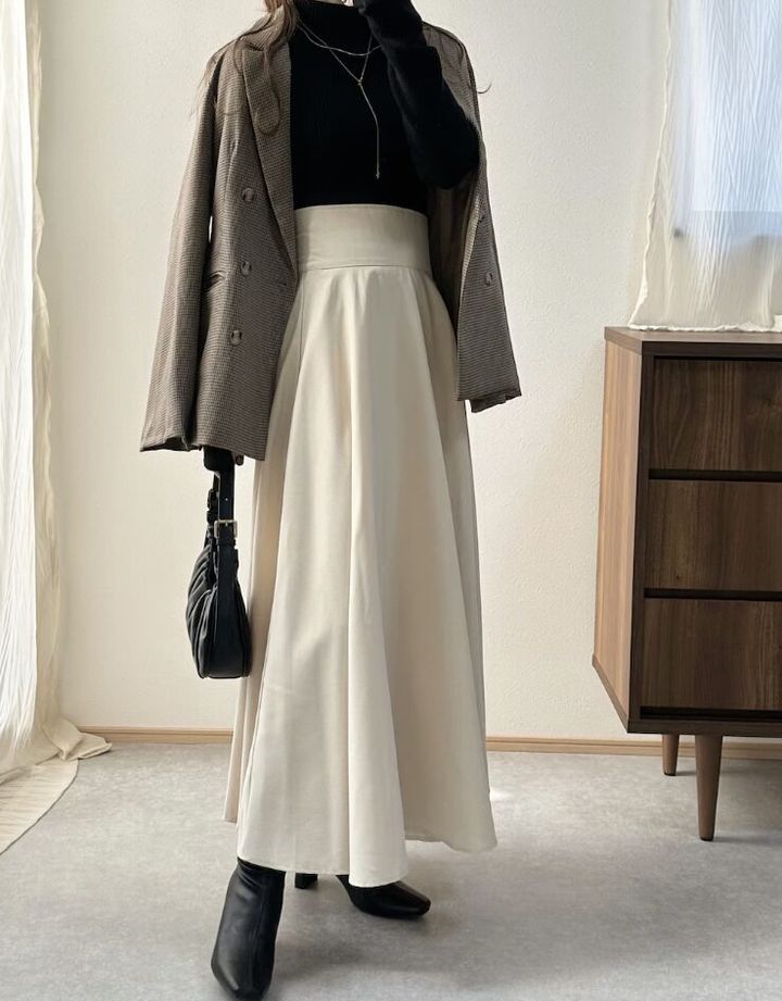 バッグやブーツで引き締めれば、上品で品格あるモノトーンスタイルに。