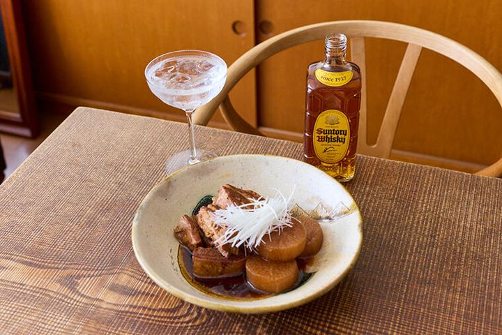 「フロートのトップのところの濃さが、豚肉の甘さや煮汁のしみた大根によく合います。フロートという飲み方を選んだのも、最初の一瞬にあるウイスキーのおいしさを、甘味や旨味の濃い料理に合わせるためです。フロートにすると、最初のひと口、ふた口に、ウイスキーってこんなに旨いんだという気づきがあると思います。角のハイボールは若い人にもよく知られていますが、ハイボールだけでなく、自分なりの好きな飲み方を見つける楽しみもあることを知ってほしいですね」