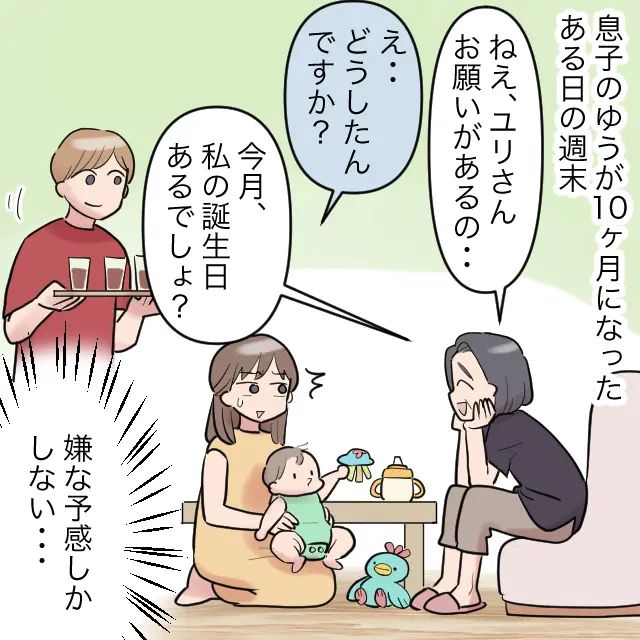2年後に男の子ゆうくんを出産したユリさんは、孫を溺愛し毎週のようにやってくる義母にすっかり疲弊していました。その後、ゆうくんが10か月になったある日のこと、義母に「誕生日プレゼントはいらないから、ゆうくんと二人で過ごしたい」と言われて呆然。それを聞いたキヨシさんがユリさんと二人で出かけることに賛成したため、断り切れず受け入れることになったユリさん、でも本当、嫌な予感しかしませんよね。