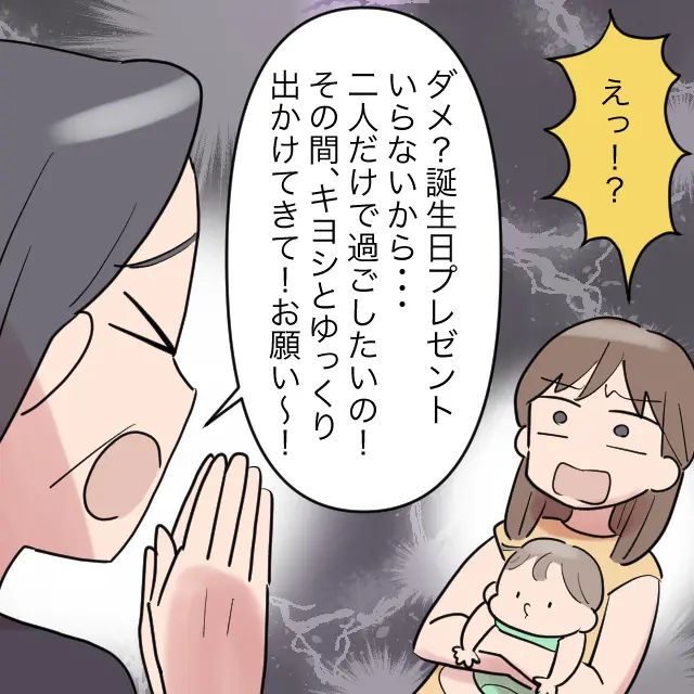 すると、「誕生日プレゼントいらないから、一日だけゆうくんの面倒を私に見させてほしいの!」とお願いポーズで言い出す義母。