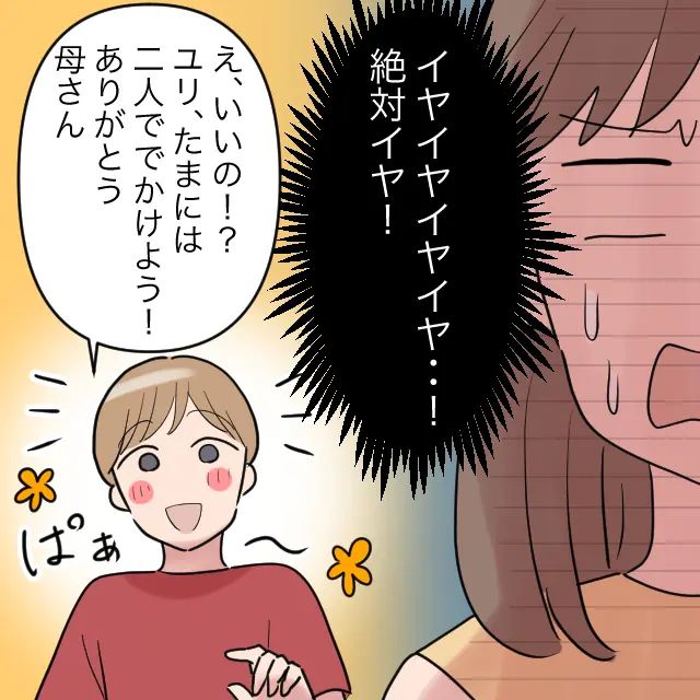「イヤイヤイヤイヤ・・!絶対イヤ!」と思っていると、「え、いいの!?ユリ、たまには二人で出かけよう!ありがとう母さん」と嬉しそうな夫・・。