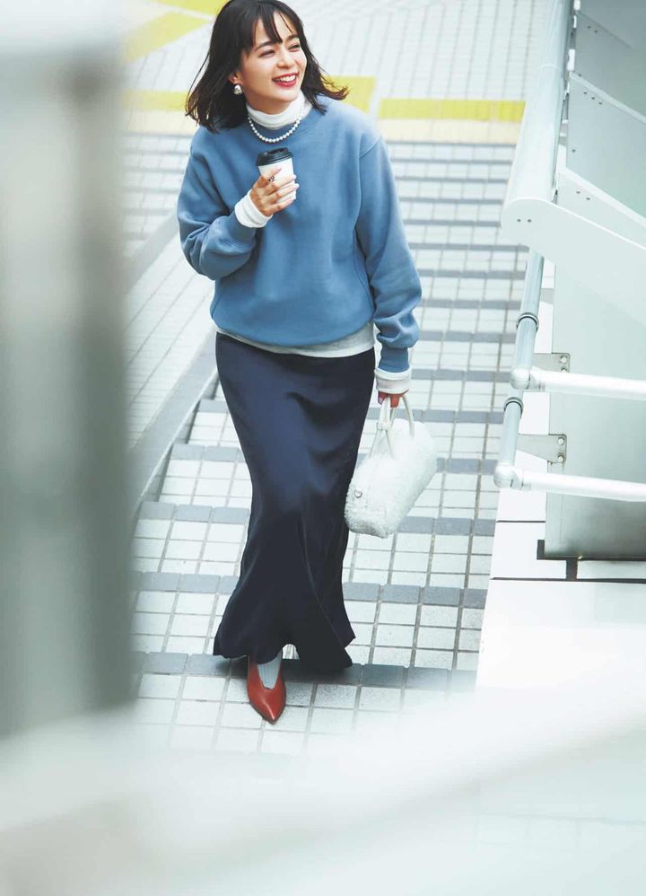 スウェット¥6,424(ユナイテッドアスレ/キャブ)シアータートルリブニット¥49,500(ルームエイト/オットデザイン)スカート¥33,000(イレーヴ)バッグ¥14,300(ツル バイ マリコ オイカワ)ソックス¥3,520(パンセレラ/真下商事)パンプス¥64,900(ペリーコ/アマン)ピアス¥24,200パールネックレス¥121,000(ともにマユ/マユ ショールーム)