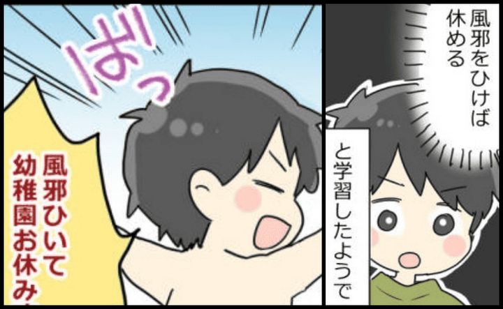 幼稚園に通っている4歳の次男は、夏休みが終わってから登園渋りがひどくなりました。登園しても泣いてしまったり、嘔吐してしまったりと、母子ともにつらい日々が続いていました。そんなとき、「風邪をひけば幼稚園を休める」と気づいた次男が、とんでもない行動に出たのです……。