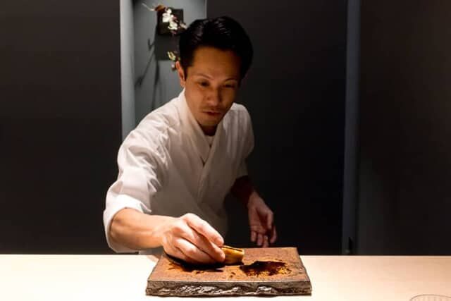 西村氏は料理自慢で知られる京都の「貴船 右源太」やハイクラスホテルの日本食レストランで腕を磨き、2025年に星のや東京「鮨 大手門」の料理長に就任。料理についての会話も弾みます。