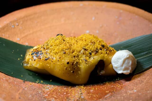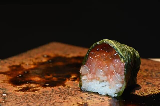 「目張寿司(めはりずし)」は、漁や山仕事のお弁当として食べられていて、塩漬けにした高菜で包んだ白米か酢飯のおにぎりで、中に刻み高菜が入ります。和歌山出身の料理長西村氏は、いくらや刻んだ中トロ、らっきょうを使ってゴージャスにアレンジ。甘みやイクラの塩味、中とろの旨味や高菜の歯ごたえもあり、口の中で様々な味が入れ替る逸品です。