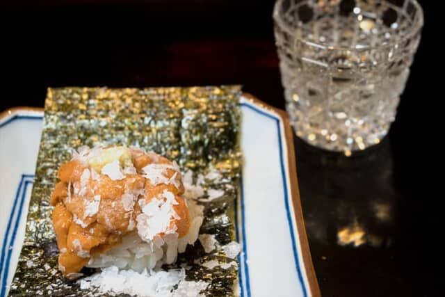 海苔にたっぷり盛られた雲丹は手巻き鮨風。米粉と塩をブレンドしたライトな塩味の “淡雪塩” が振られ、絞ったすだちの、爽やかな風味が口の中に広がります。「特別純米生原酒 山廃仕込み うらなぎ」は、“日本の里100選” に選ばれた丹後半島の山間にある上世屋地区の棚田で作られたコシヒカリを使い、蔵住みの天然乳酸菌を使った山廃仕込み。米の旨味を感じるスッキリ柔らかなやや辛口を、濃厚な雲丹の味に合わせます。