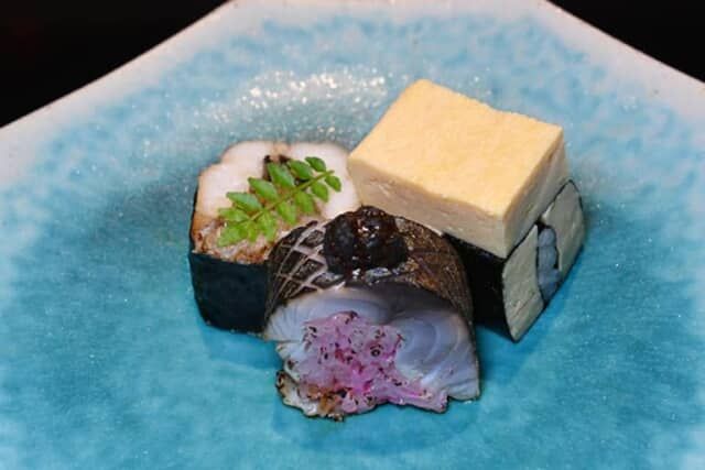 最後の一品は多彩な味のグラデーションが楽しめる「棒寿司」。鯖の棒寿司には柴漬けのシャリが入って生姜味噌をトッピング。鯖の脂と味噌のコク、柴漬けの爽やか酸味が口の中で混じります。秋に旬を迎える脂ののった名残鱧の照り焼きや、屋根の形になったユニークな玉子焼きなど、最後まで楽しませてくれるひと時でした。