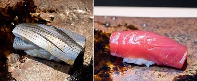 初めの一貫は小肌と相性のいい赤酢を使い、柔らかく仕上げています。赤身の早漬けは魚の旨味を引き出すため、醤油に3分ほど漬けたもの。伝統の江戸前を味わいました。