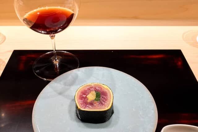 大トロを食したところで、地方特有の鮨や料理長が腕を振るうクリエイティブな鮨が登場します。ペアリングのワインや日本酒も、それに合わせてさらに個性が高まります。