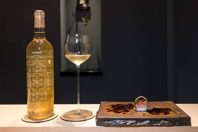 いよいよ変わりダネ同士のペアリング。和歌山県の郷土料理「目張寿司」に合わせるのはスペイン・カタルーニャ地方の「コネクシオ・コスミカ」。ブドウ品種はカタルーニャで広く栽培されるチャレロで、オレンジの皮や種を8日ほど漬け込んだ個性派です。柑橘の爽やかな酸味や苦味が感じられるオレンジワインは印象的な一杯。「目張寿司」と「車海老」の握りに合わせました。