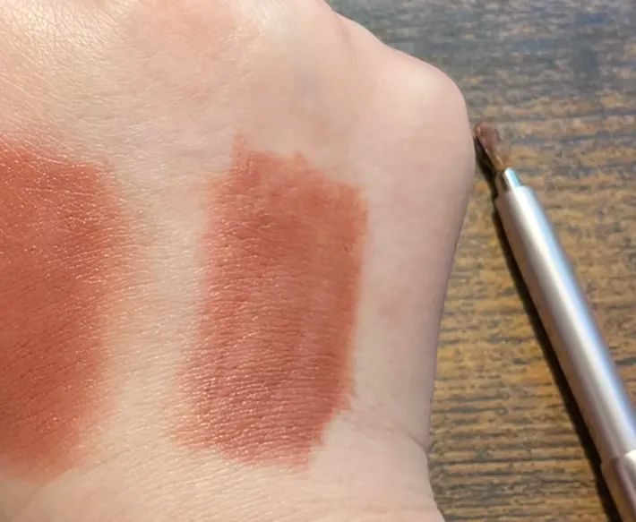 比較のために、左はシリコン製のリップブラシ、右は筆のリップブラシでぼかしたり広げたりしていきますよ。