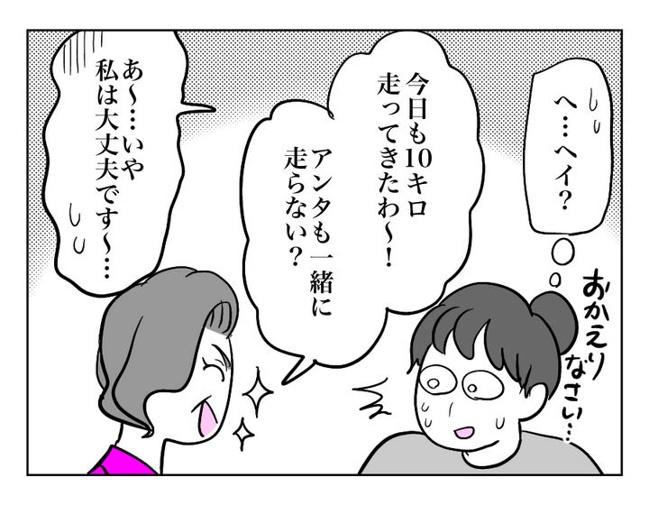 ド派手なジョギングウェアを着ているお義母さんに声をかけられたクミさん。はつらつとした様子で10kmも走ってしまうなんて、本当に元気なお義母さんですね。会話のところどころで謎のカタカナ語を繰り出すなど、かなり個性的な性格でもあるようで……。ポカンとしてしまうクミさんの気持ちもわからなくはないですね。
