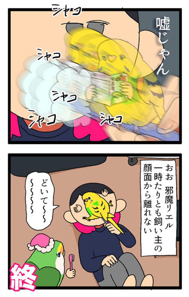 2. 無抵抗すぎるセキセイインコ…もしや飼い主の顔が好き?【鳥マンガ #152】