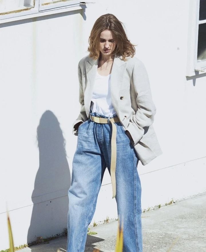 「ぶかっとしたウエストをキュッと締め上げたときに生まれるニュアンスを求めてデニムやチノは、あえてワンサイズ上やメンズサイズのデニムを選ぶことも。ジャケットスタイルなど、まじめな装いに1つポイントをつくるイメージで。まずは古着屋さんにあるメンズのデニムなどから試してみるのもいいと思います」(スタイリスト・樋口かほりさん)