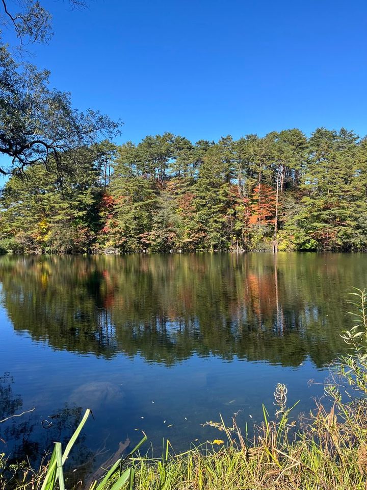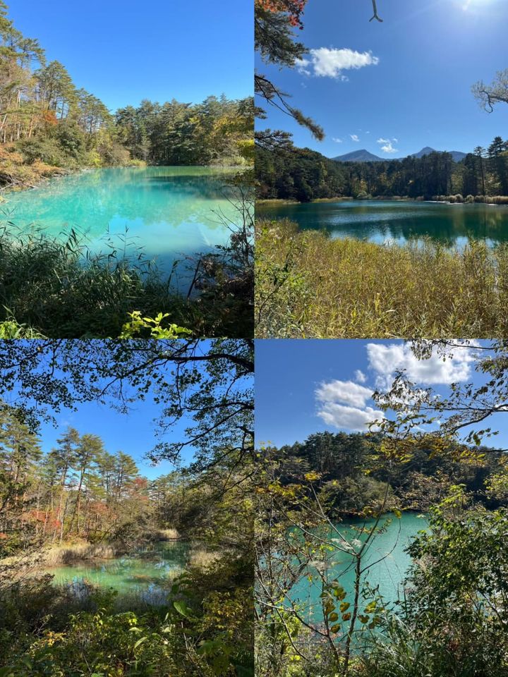 まずは柳沼からスタート! この沼の見どころは紅葉時期らしく、美しく色づいた木々が湖面に美しく映るそうです。筆者が伺った10月24日は少し色づいた程度でしたが、これはこれで美しかったです。何より感動したのは、青沼をはじめとする自然が作り出したキレイなブルーの沼。それぞれちょっとずつ色が違っていて、その違いを見つけるのも何気に楽しかったです。