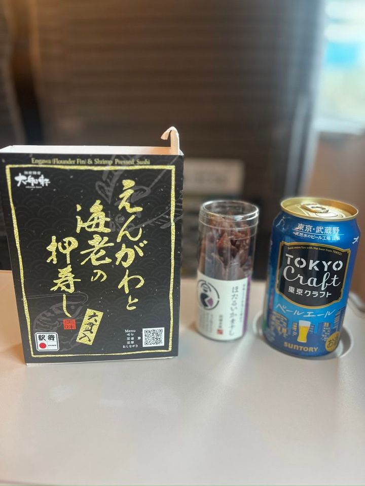 新幹線での駅弁ランチはこちら。いろいろ迷った結果、お酒好きがバレるラインナップになってしまいました(笑)