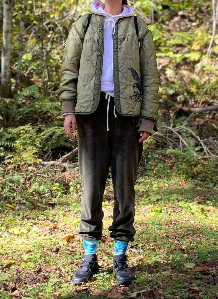 アウトドアとは無縁の生活を送っているので、ハイキングっぽく見えそうなアイテムをかき集めてスタイリングしてみました。ソックスとパンツのバランスが微妙ですが、そこはご愛嬌で(笑)