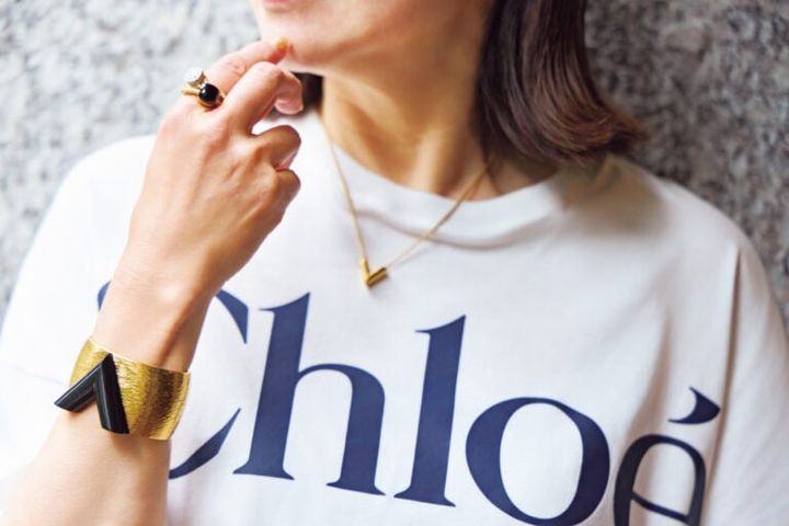 アクセントになるバングルとネックレスは「ルイ・ヴィトン」。「バングルは、つけるだけで手元が細くきれいに見えるので気に入っています」