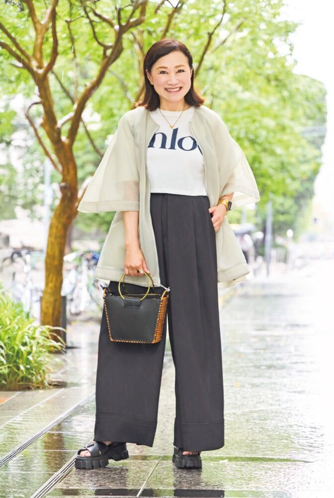 いまっぽい短め丈の「クロエ」のロゴTシャツに、「スタイルミキサー」のワイドパンツを合わせたスタイルアップコーデ。「『セルフォード』のシアージャケットは袖部分がふんわりしていて、羽織るだけで大人可愛い雰囲気になり、着こなしが上品にまとまります」