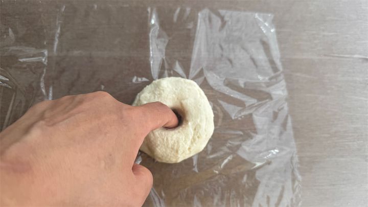 3. 軽く濡らした手で丸めて平らにし、真ん中に指で穴をあけて広げて輪っかにする。広げておいたラップにひとつずつ乗せてふんわりと包む。