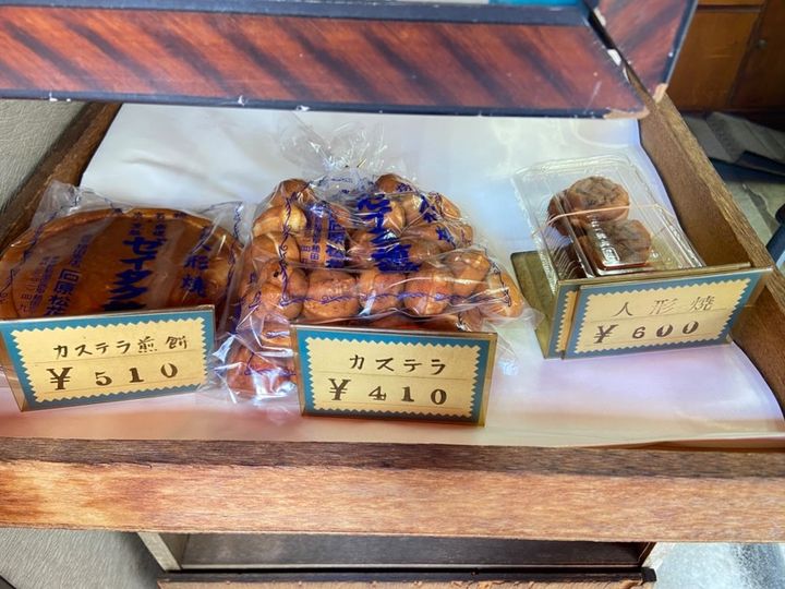 私が訪問した時間帯は、店内奥で人形焼きを焼いていました。甘いいい香りが広がっていました。店内入り口のショーケースには、人形焼・ビンズ・カステラなどが並んでいました。どれも美味しそうで、自宅用・手土産・贈答品にもおすすめですよ。