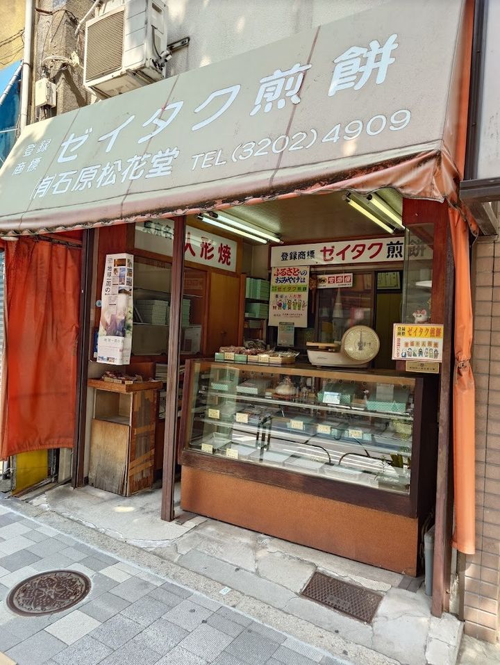 西早稲田駅出口1から徒歩約4分の所にある【石原松花堂 】さんです。石原松花堂さんは、先代の方が戦後に重盛永信堂に修行に行き、のれん分けされたそうです。名物のゼイタク煎餅は、先代の方が重盛永信堂本店で修行してきた味をそのままに保ち、今も手焼きの製造方法を守り続けているそうですよ。